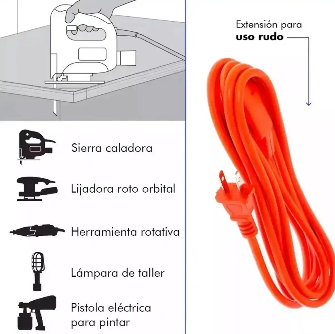 Extensión eléctrica uso rudo flexible con 3 tomas de corriente. Podrás mantener conectadores diferentes aparatos eléctricos al mismo tiempo, de forma segura y práctica.